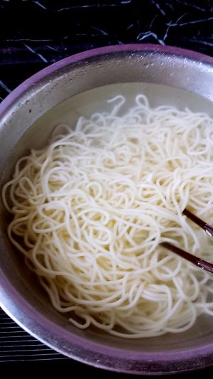 接着来准备面条:另煮一锅热水,加少许盐和油后,放入挂面煮熟