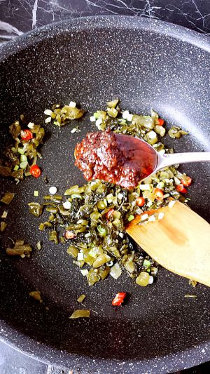 炒锅,热锅凉油小火,放入葱姜一半朝天椒,酸菜不停翻炒约三分钟