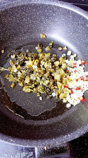 无水无油锅里炒干酸菜水分,放凉备用
