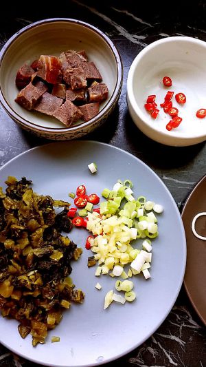 1.酸菜多洗几次去异味,挤干水分切小块 2.朝天椒切粒 3.事先卤好的酱牛肉切块 4.葱姜切末