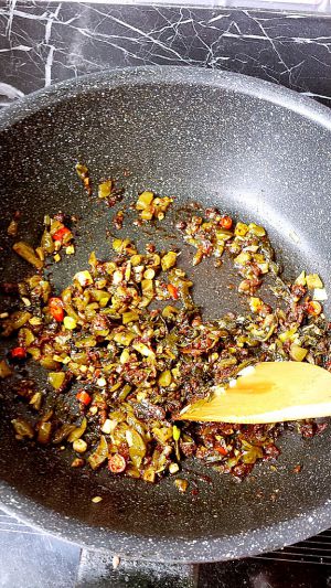 放入五勺牛肉酱炒匀