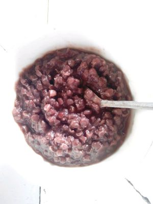 红豆加水,高压锅半小时左右,用小塞子滤过水,红豆渣放入平底锅加油翻炒至干(期间边加入白糖)搓成圆球待用