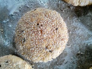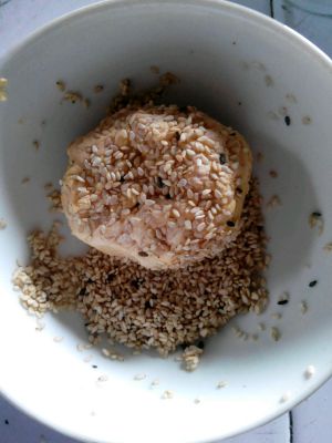 将小圆放入芝麻碗中晃几下,让它沾上芝麻,这样按压的时候就不会粘手了