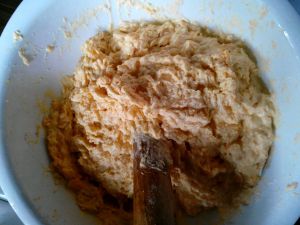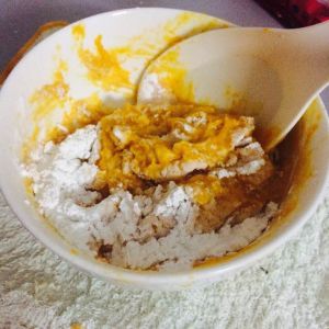 将熟透的南瓜和糯米粉和在一起,搅拌时可加入南瓜碗中渗出的水