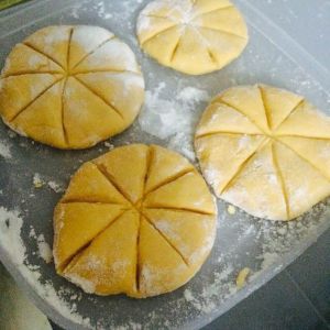 用刀背划出痕迹,其实就是写个"米"字,然后再表面刷一层“蜂蜜和白糖”。