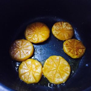 开电加热电饭锅,锅热放黄油,等油热了再放南瓜饼下去,不要急着翻转,等变金黄色再翻。