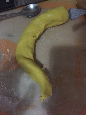 取一小团面窝成小窝,然后放入香蕉泥,搓成团,压扁!撒上芝麻!