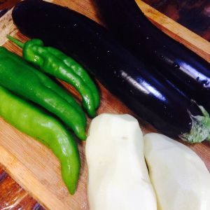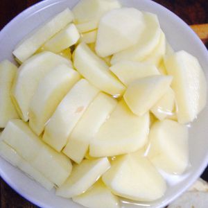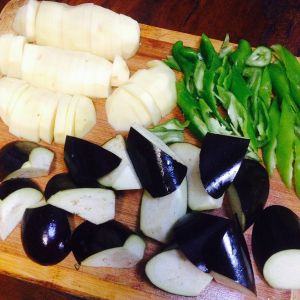青椒~对半切开,切成片 茄子~切去蒂,滚刀片 土豆~切厚片