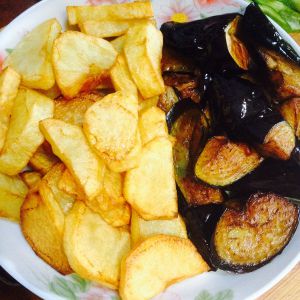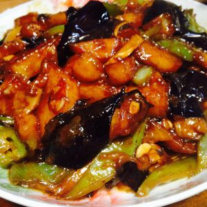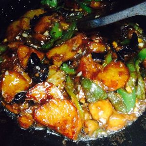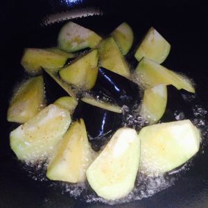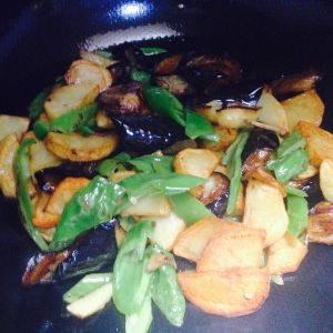 茄子出锅,留少量的油在锅里,放入辅料葱蒜等,翻炒后放入炸熟的土豆茄子,加调料,在加入适量的水炖菜,待菜快出锅时拌入淀粉,成品汁更浓