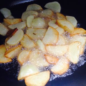 继续大火,下土豆,高油温炸至两面金黄,外皮起脆,即可出锅