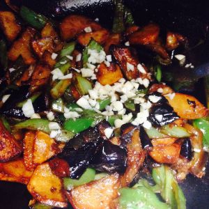 放入辣椒、炸好的茄子、土豆炒,最后放入蒜末即可