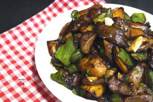 土豆和茄子切滚刀块,柿子椒切差不多大小的片,土豆过油煎至表面金黄,茄子煎软备用