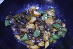 锅中放少量底油,油热后放葱姜煸炒出香味后下茄子、土豆和柿子椒煸炒