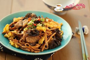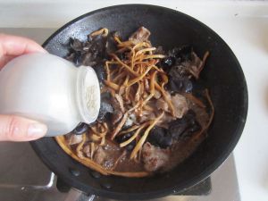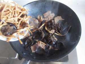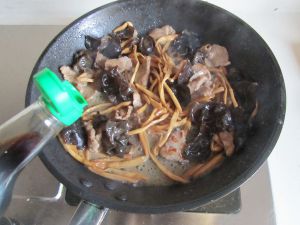 肉片滑炒变色后加入泡好的黑木耳和黄花菜进去翻炒;