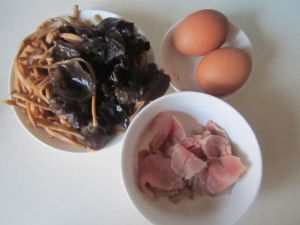 黑木耳温水浸泡至发,猪肉切片,鸡蛋炒熟。