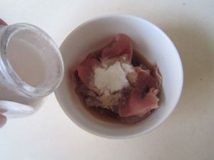 里脊肉片加入适量的盐、淀粉、生抽和料酒拌均匀腌制一下;