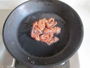 锅中再倒入少许油, 放入腌制好的肉片进去滑炒;
