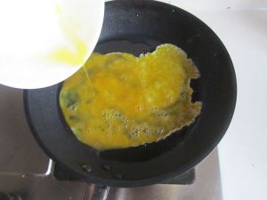 待鸡蛋液慢慢煎至定型后用筷子划成小块,炒好后盛出来备用;