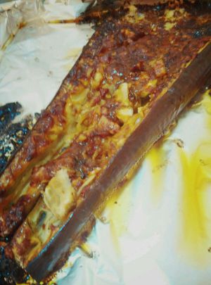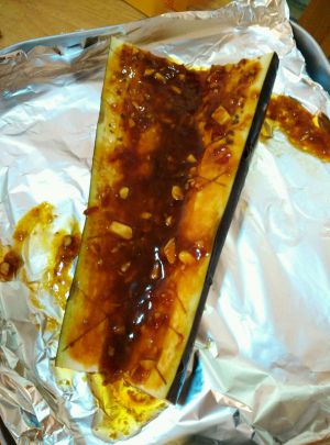 茄子蒸好后放入锡纸盒(烤盘铺锡纸当然也可以)