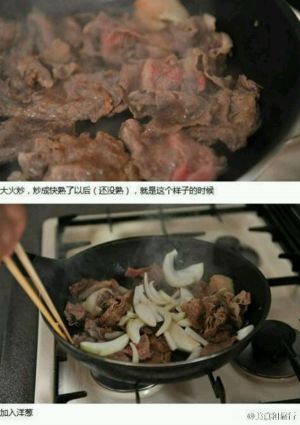 将肥牛和洋葱一起翻炒,加入适量的盐,少许的白酒,和老抽