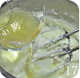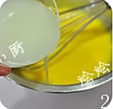 取1/3蛋白倒入蛋黄糊中,用手动打蛋器拌匀。