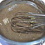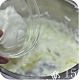 关火后一边用打蛋器搅打,一边倒入打发好的蛋黄,将蛋黄烫熟。再搅打5分钟左右,至蛋黄糊的温度冷却