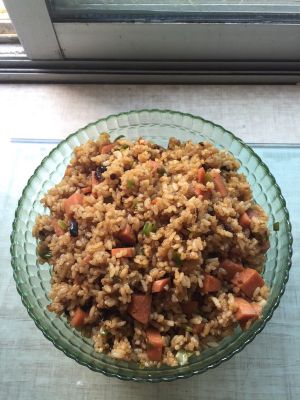 双手小心地把小碗抬起来,多彩的酱油炒饭就做好了。