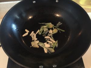 热锅加少许油下入姜花炒香,放入红萝卜花炒至断生。
