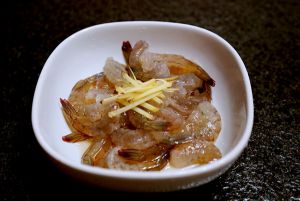 开好背的虾仁加入料酒,姜丝,几滴芝麻油拌匀,腌制10分钟