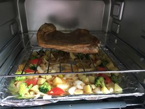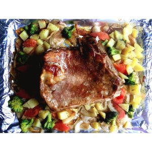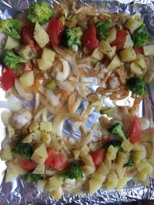 准备配菜,所有配菜去开水煮,吸入水分后用油略微炒一下,放入黑胡椒,盐调味,铺入烤盘
