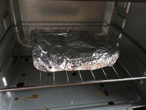 冷藏好的羊排用锡纸包好放烤箱中层,上下火230度烤50分钟
