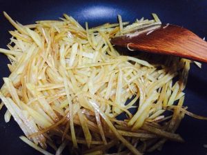 随后倒入土豆丝下锅翻炒,加入一小点白醋