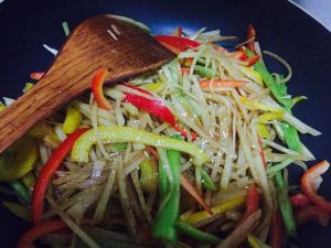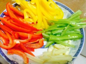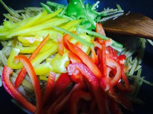 土豆丝8成熟,下入切好的三色彩椒丝。原谅我切的太难看。。。本人不是刀功的。