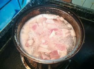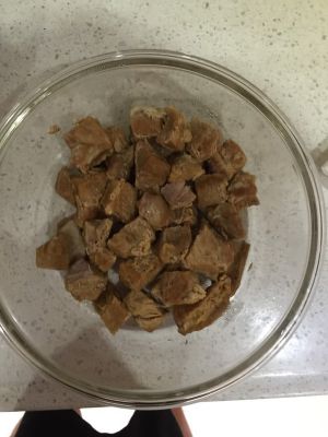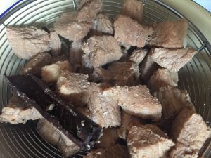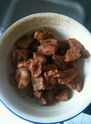 肉切成小块。(我这失误了,切的比较大,最好再切小一点)高压锅加适量水,放入肉块,大火烧开转小火蒸30分钟,捞起沥水。