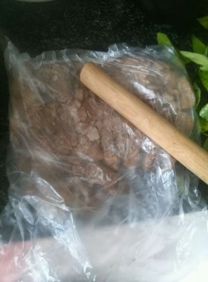 用保鲜袋装好,擀面丈敲打把肉揉碎