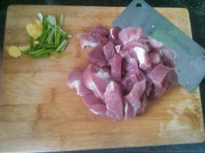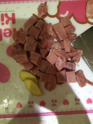 准备食材,里脊筋膜去掉,把肉切成小块,我切了3块姜放一起去腥