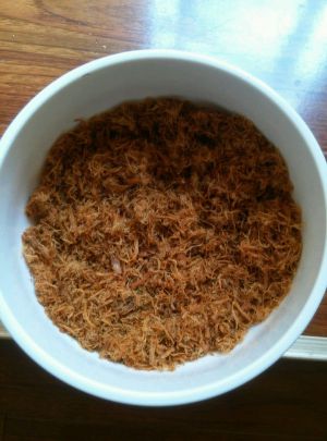 肉差不多成肉丝后,开小火,不停地翻炒肉丝,炒干他的水分,中间分两次加糖调味,炒的差不多的时候用筷子把肉打散蓬松。
