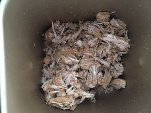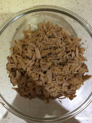 肉洗净放高压锅煮两个小时把肉彻底煮烂。把肉捞起来放平底锅,先不开火,趁肉还热把肉压碎,加盐酱油调味。
