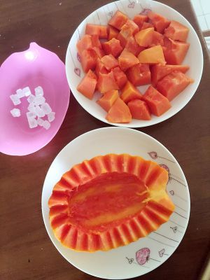 木瓜削皮 把籽扔掉 切成块 不用太小 放入锅中一起炖 再炖半个小时