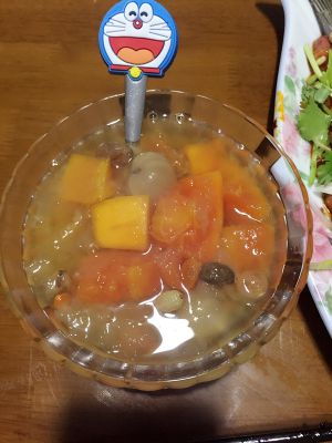 放入桂圆和冰糖煮十分钟,最后加小块木瓜和葡萄干枸杞子煮五分钟。