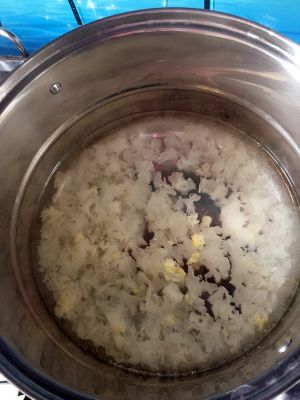 银耳泡好用剪刀剪碎一次加足水放锅里大火烧开,转小火炖出胶原大概一小时左右!