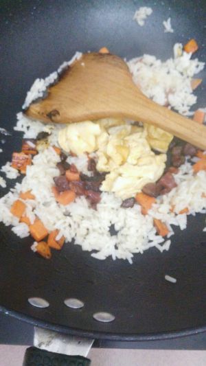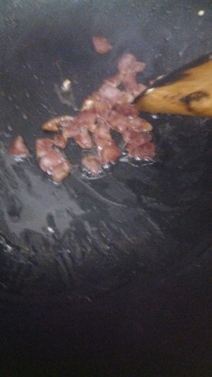 广味香肠炒熟放碗里备用(为什么要把广味香肠分开炒呢,一个是炒的时候会有油出来,油太多做出来的饭太油腻,二是炒广味香肠出来的油会有香肠本身的味道,会影响饭的味道)