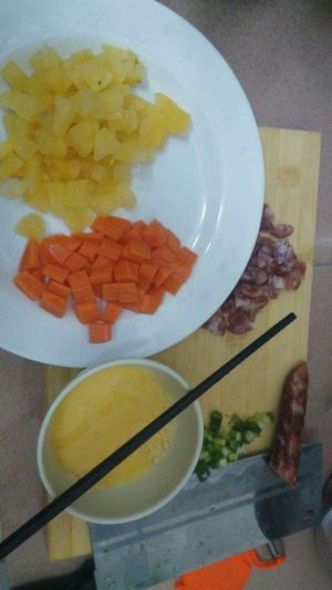 青豆、胡萝卜、洋葱、菠萝热油炒至半熟。