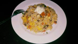 锅里放油先把洋葱和鸡肉炒香,再放入胡萝卜、青椒、玉米、冬菇加少许盐和胡椒调味