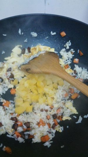 这时再把米饭倒入,再倒入菠萝粒和加少许咖喱粉一起翻炒均匀