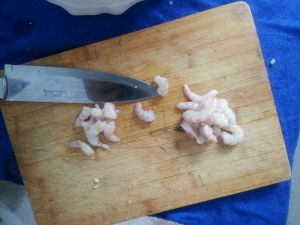 新鲜大虾仁切段备用。
