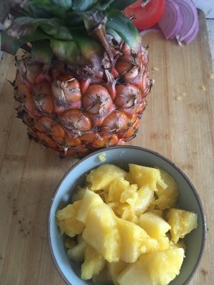 早市上买的新鲜菠萝一只,尽量挑熟透的。用勺去果肉,切丁备用,外皮留着一会当容器!