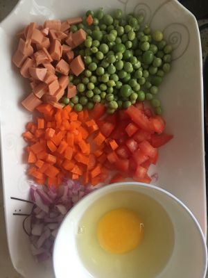 胡萝卜,肉丝炒熟、加入米饭,适量盐!