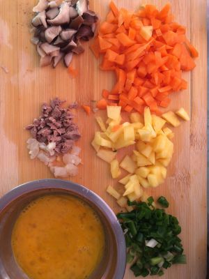 蛋打碎搅拌均匀,切葱末,菠萝末,肉丝,胡萝卜丁,也可以加自己想吃的!