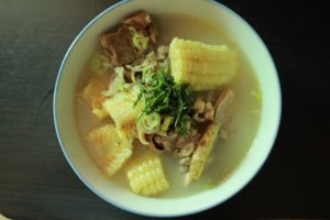 一小时煮好后,放入玉米和鱿鱼。继续煮20分钟。